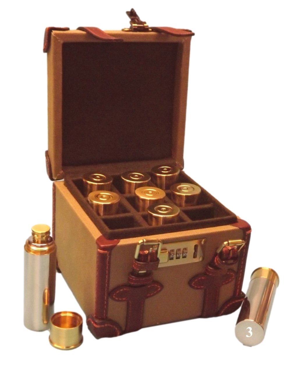 9 x 3oz stainless steel and brass hip flasks , numbered 1-9 and housed in a carrying case in a sage green canvas with brown leather trim.
