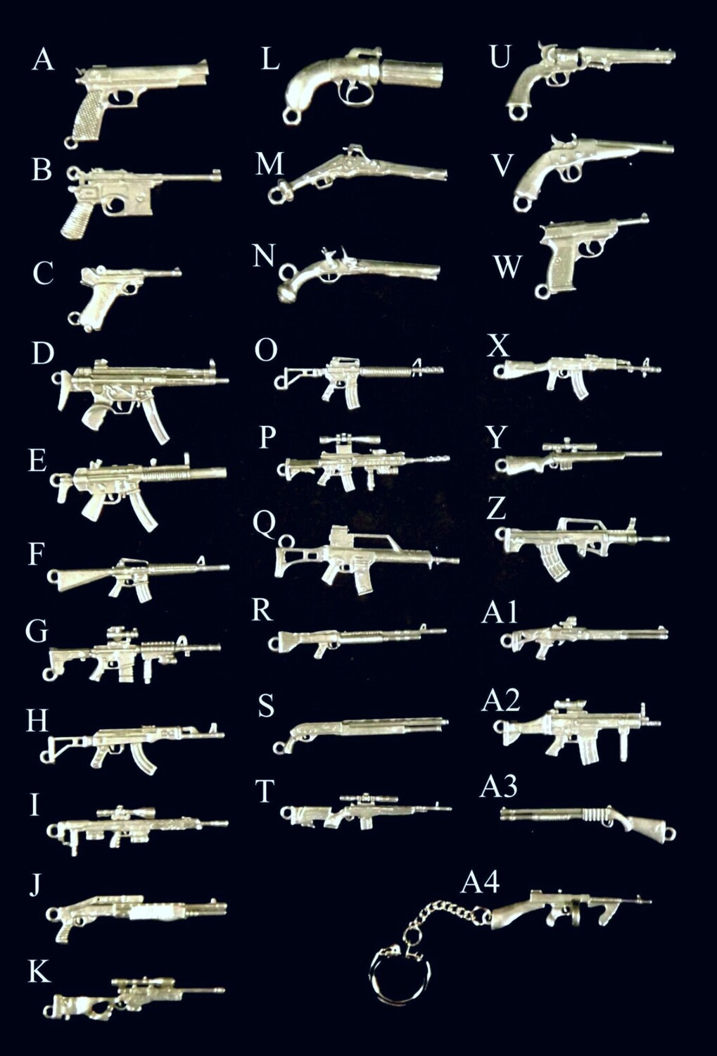 A...Desert Eagle, B...C96 Broomhandle Mauser, C...Luger P08, D...MP5, E...MP5 SD3, F...M16, G...M4, H...AKS 47, I...Sniper Rifle, J...SPAS Shotgun, K...L96 Sniper Rifle, L...Pepper Box Pistol, M...Wheel Lock Pistol, N...Flintlock Pistol, O...M16 Skeleton Stock, P...M4A1, Q...H&K G36, R...M60 Machine Gun, S...Mossburg Tactical Shotgun, T...M14, U...1851 Navy Colt, V...1871 Rolling Block Pistol, W...P38, X...AK 47, Y...M700, Z...Steyr AUG, A1...XM1014 Shotgun, A2...SCAR Assult Rifle, A3...Shotgun Rifle, A4...Thompson Sub Machine Gun, A5...WWII Webley Revolver, A6...WWII Enfield Revolver, A7... 1847 Colt Walker, A8...1836 Colt Paterson, A10...1860 Army Colt, A12...Well Fargo, A13...1862 Colt Pocket Pistol, A14...2nd Colt Dragoon, A15...1855 Colt Pocket Pistol.