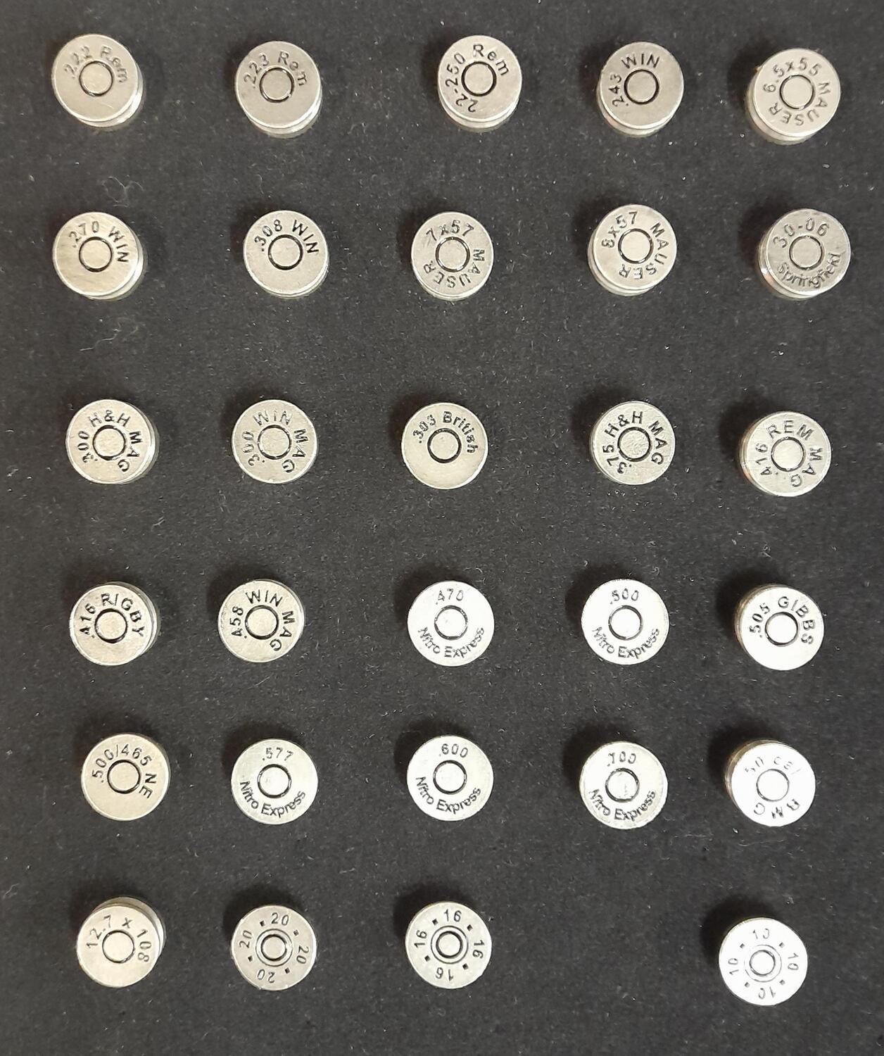.222 Rem, 223 Rem, 22-250 Rem, .243 Win, 6.5 x 55, 270 Win, 7 x 57, .308 Win, 300 Win Mag, .300 H&H Mag, 30-06, 303 British, 8 x 57, .375 H&H, .416 Rem Mag, .416 Rigby, .458 Win, .500 Jeff, .505 Gibbs, 50 cal BMG, 12.7 x 108.