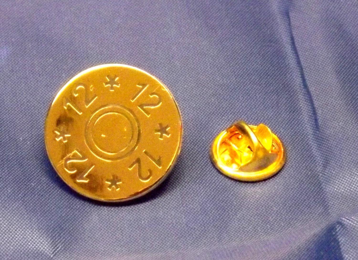 12 & 20 gauge gold plated lapel pins ( not real cartridge bases) with black enamelled markings