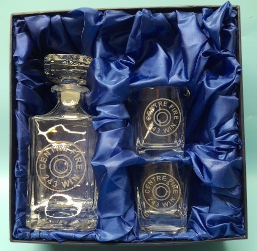 Glass decanter (750ml) with 243 Centre fire engraving along with 2 x 27cl square whisky glasses with same engraving