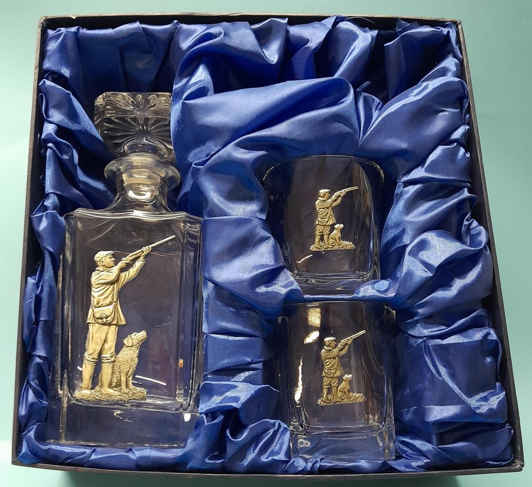 Glass decanter (750ml) with shooter and dog embellishment along with 2 x 270ml whisky glasses with shooter embellishment.