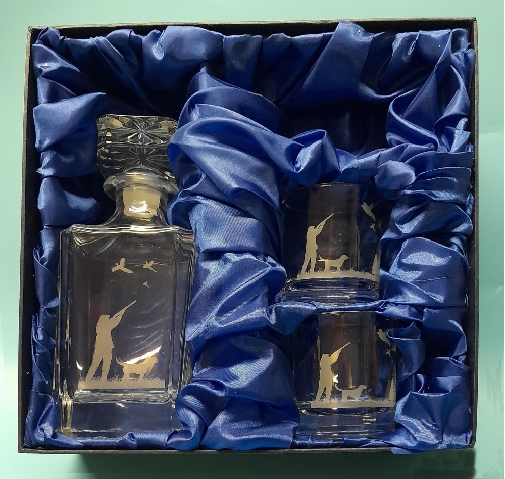 Glass decanter (750ml) with shooter and dog engraving along with 2 x 20cl round whisky glasses with an engraved shooting scene