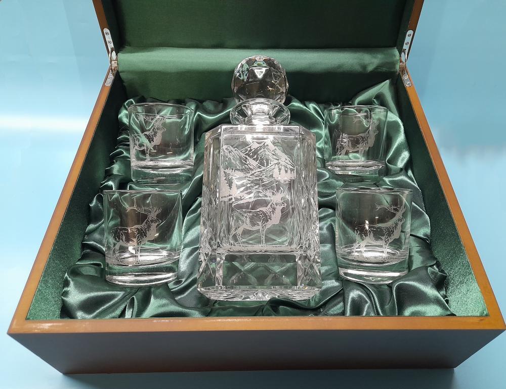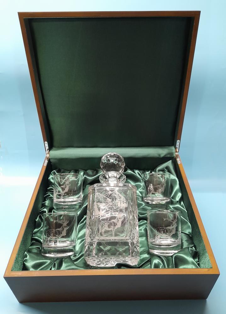 Red Deer Scene Engraved Crystal decanter and 4 whisky glasses in a wooden gift box