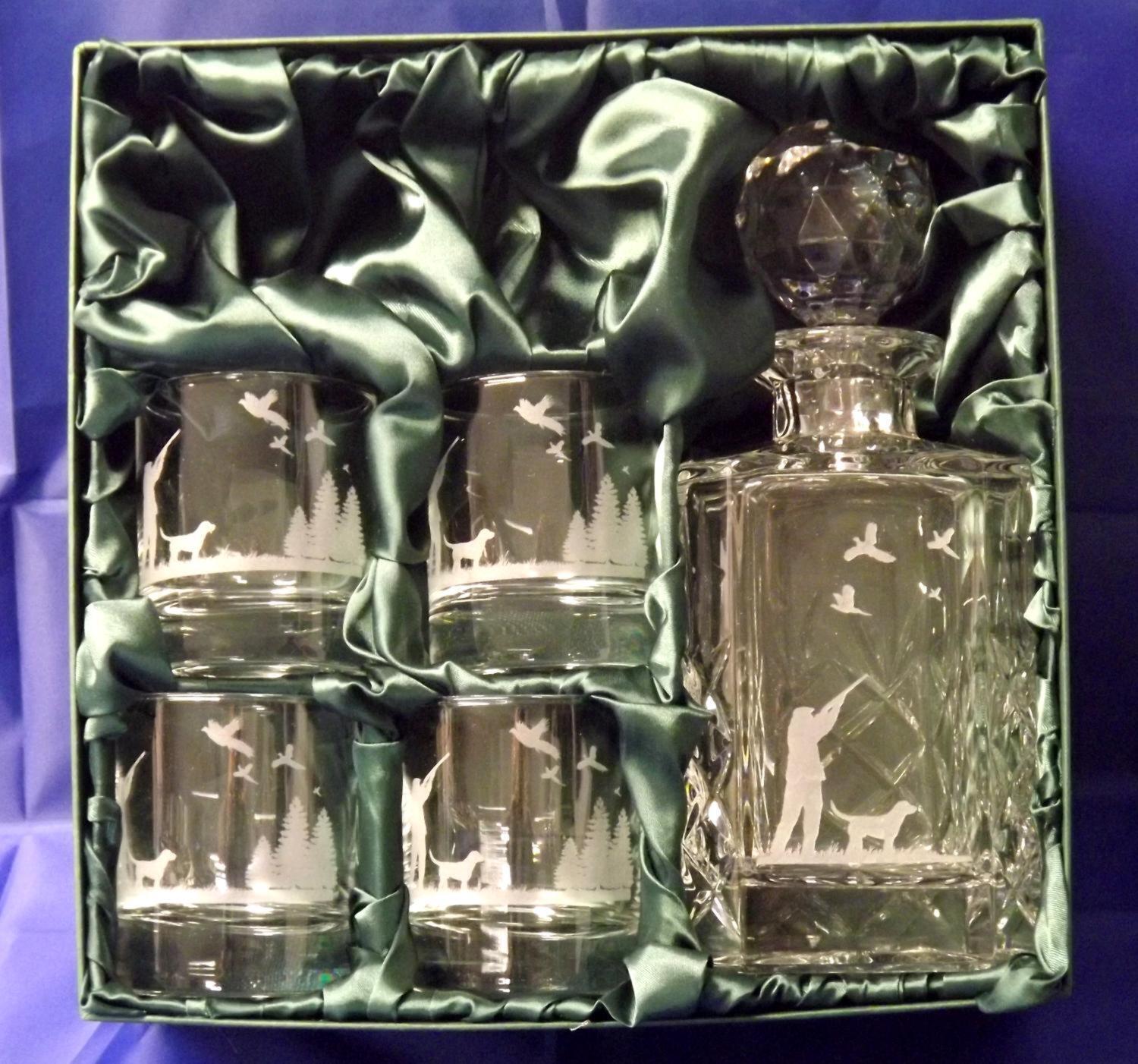 Beautiful cut Polish lead crystal decanter and 4 whisky glasses (not crystal), all engraved with a single image. Gift boxed in satin lined green card box. Makes an ideal present.