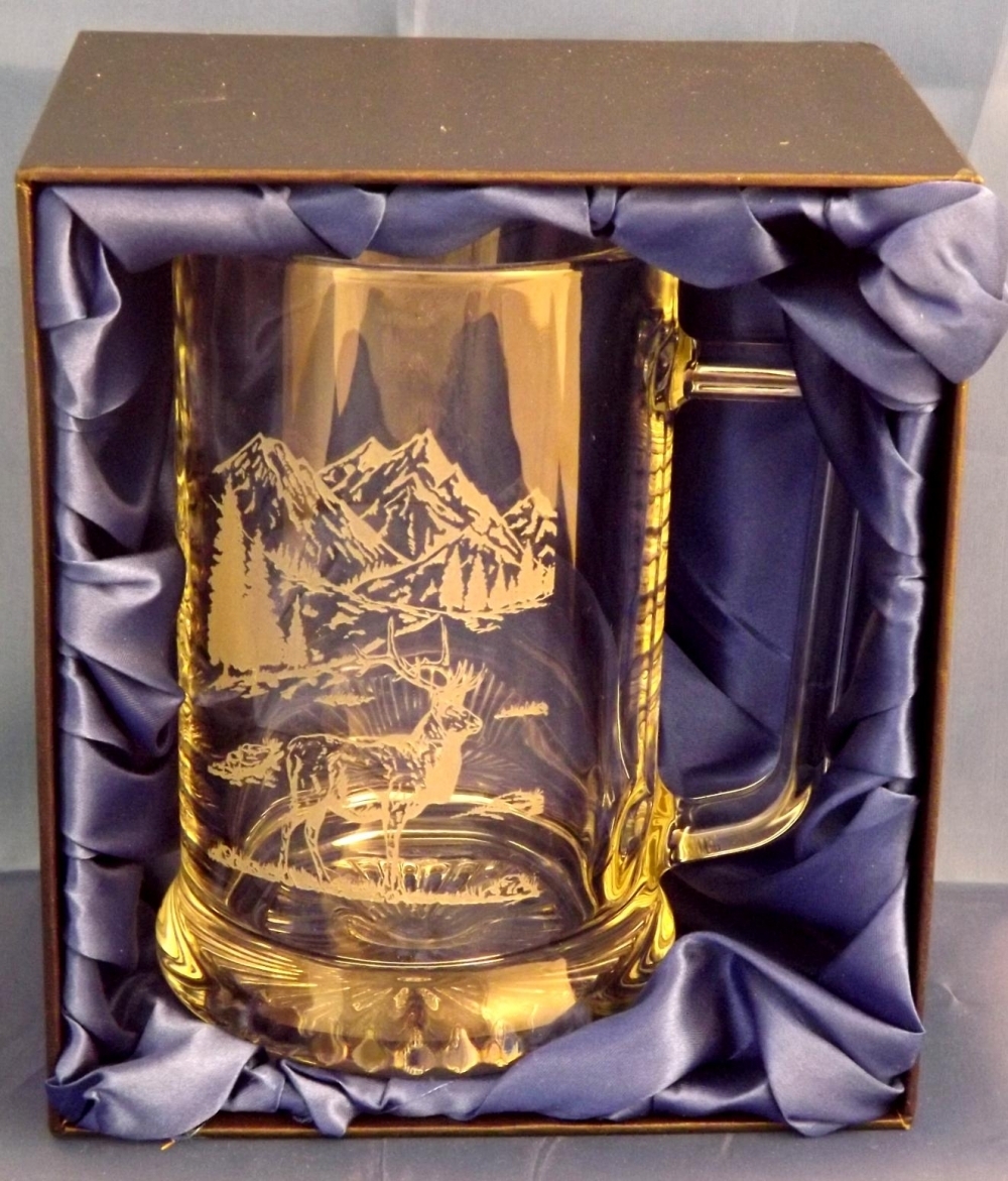 Engraved Deer scene on large 0.57 ltr tankard in satin line gift box or plain blue box