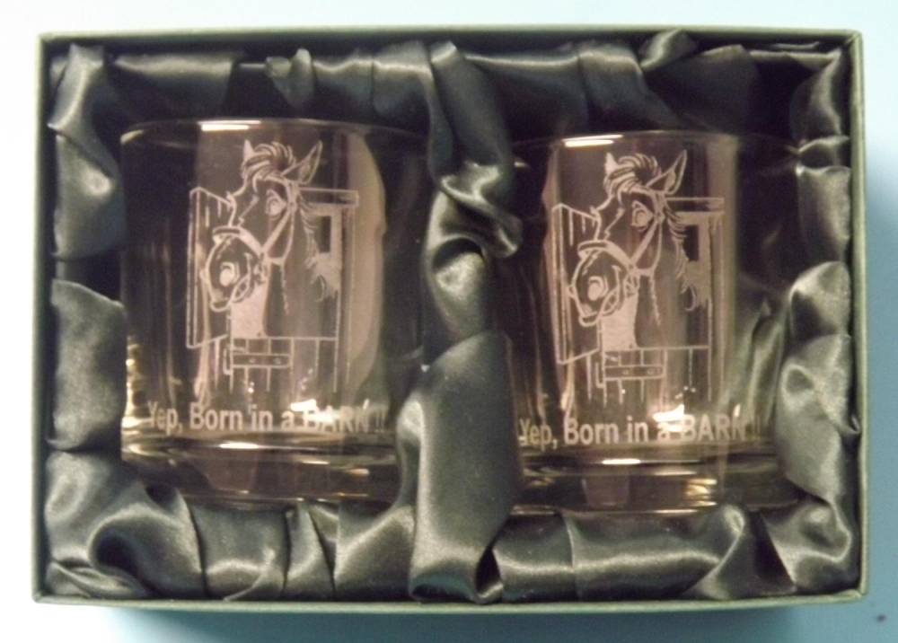 2 Engraved Whisky Glasses with "Yep Born in a Barn" image