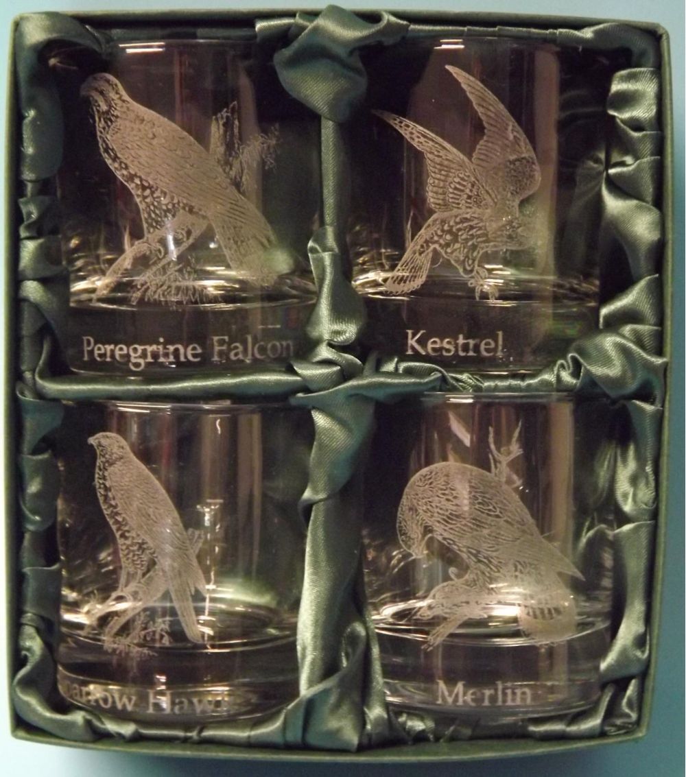 Set of engraved whisky glasses ,in a satin lined card presentation box.