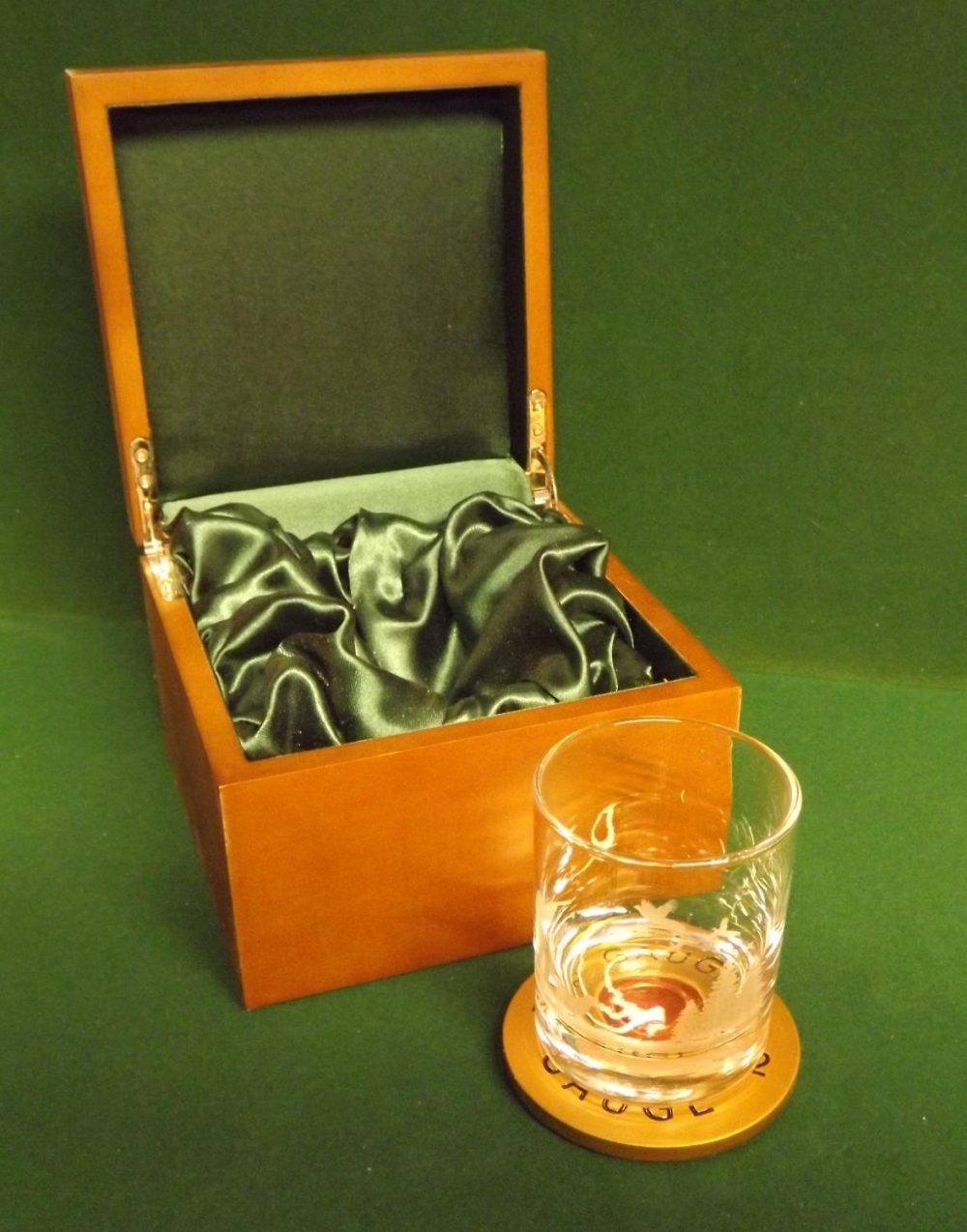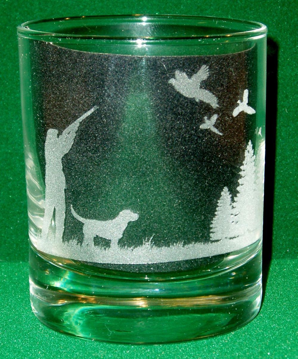 Wooden gift box containing a single (20cl) engraved whisky glass of Pheasant shooting scene along with a shotgun cartridge base coaster.