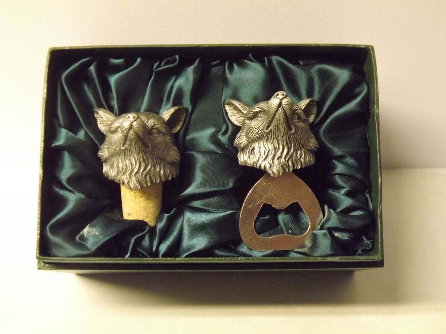 Beautiful white metal and nickel plated Fox head bottle combo set.