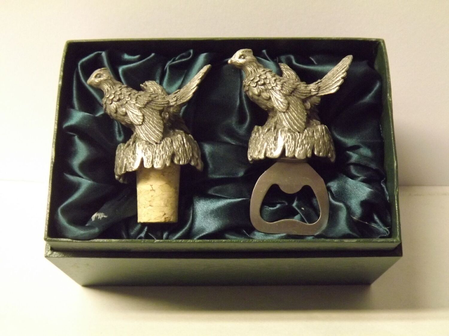 Beautiful white metal and nickel plated Ruffed Grouse bottle combo set.
