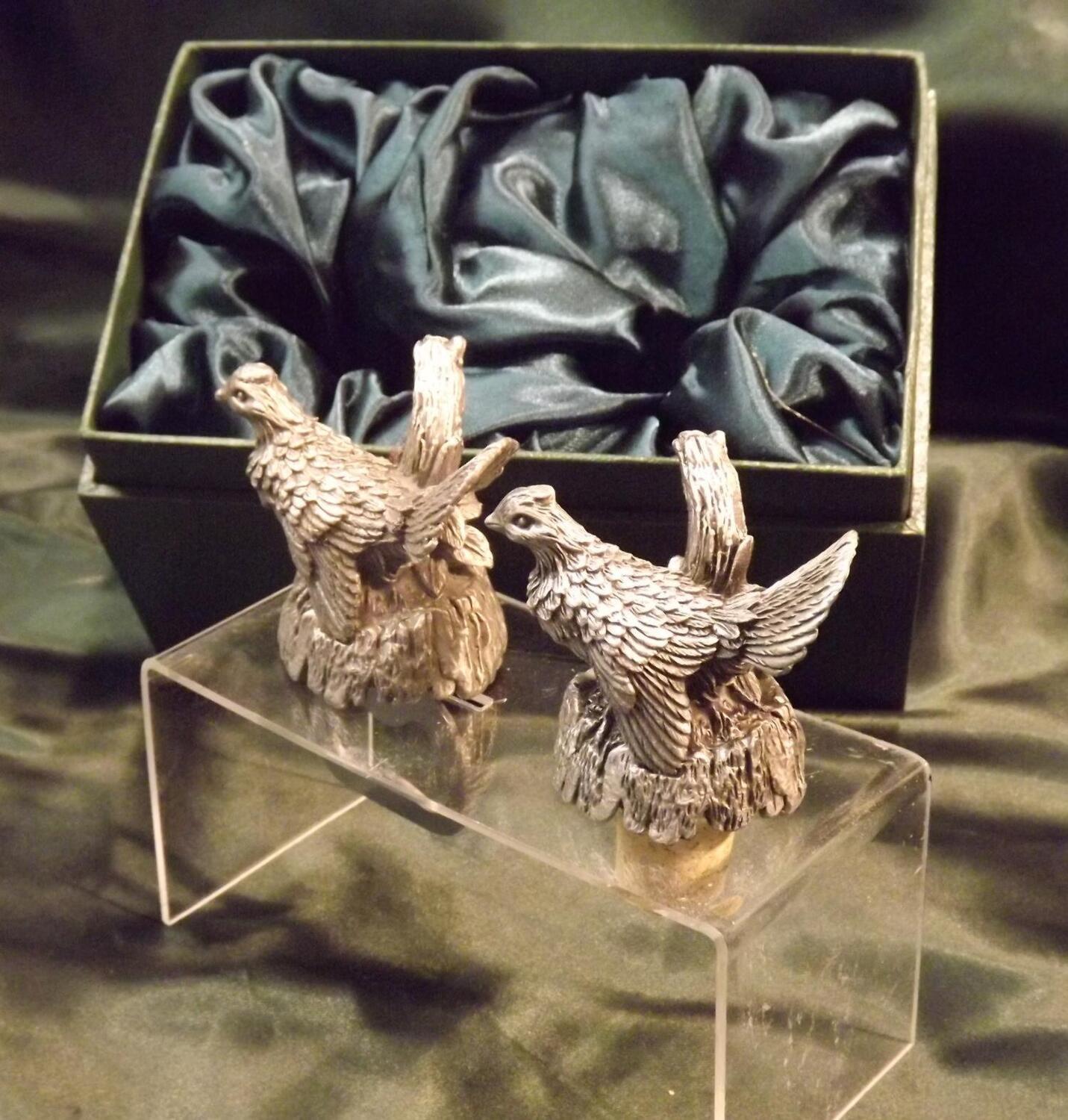 Beautiful white metal and nickel plated Ruffed Grouse bottle combo sets.