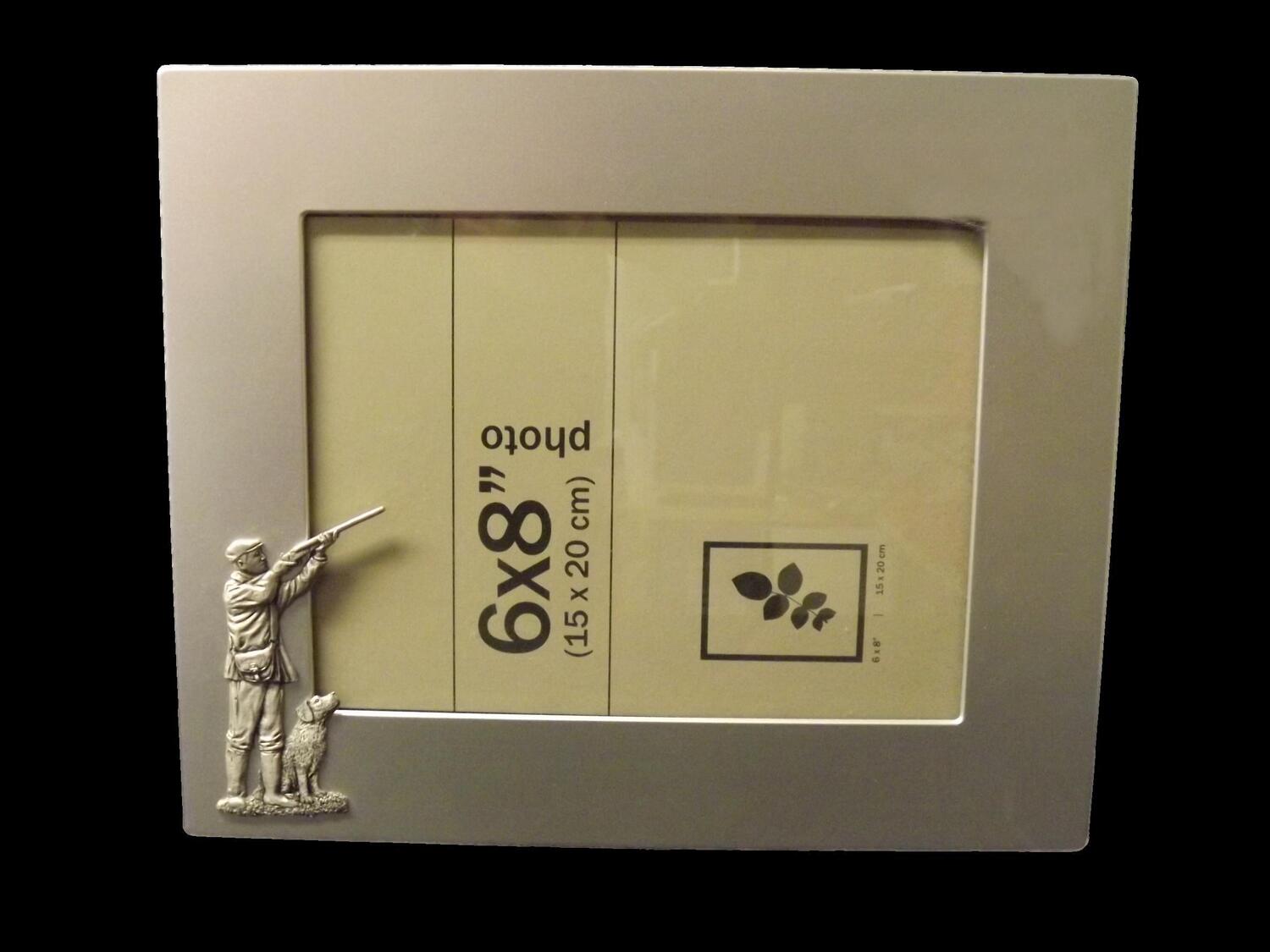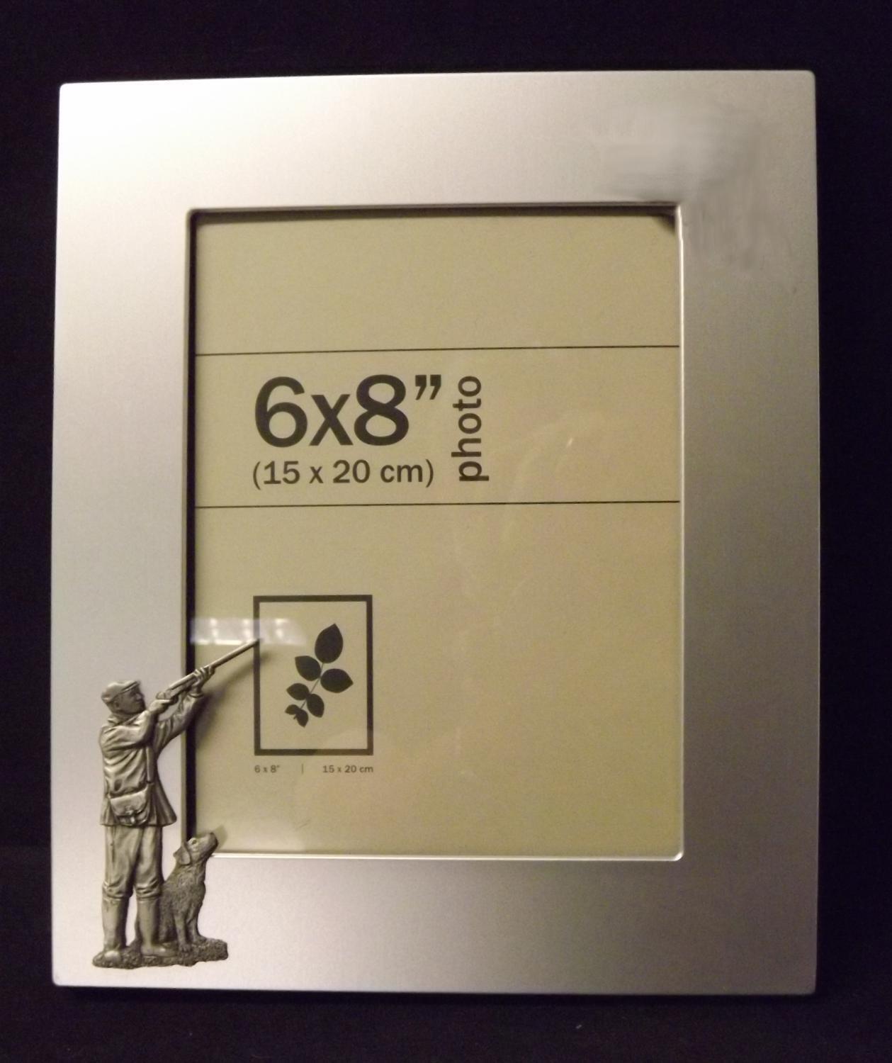 Large brushed aluminum picture frame with a pewter Shooting embellishment.