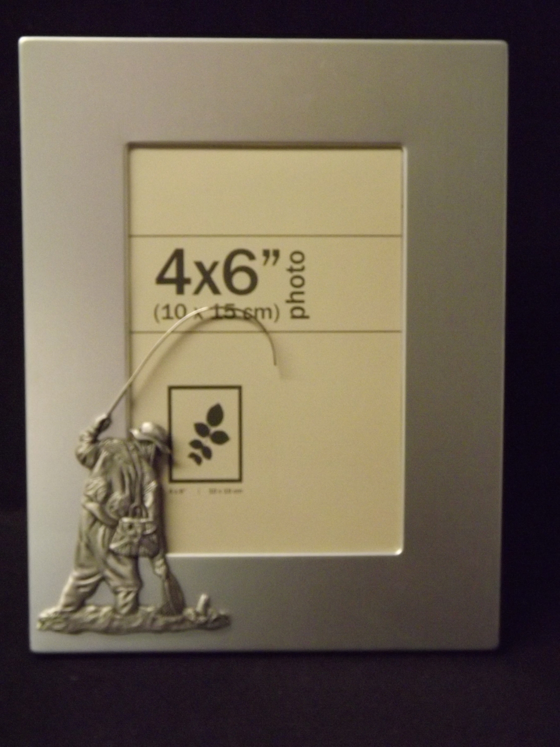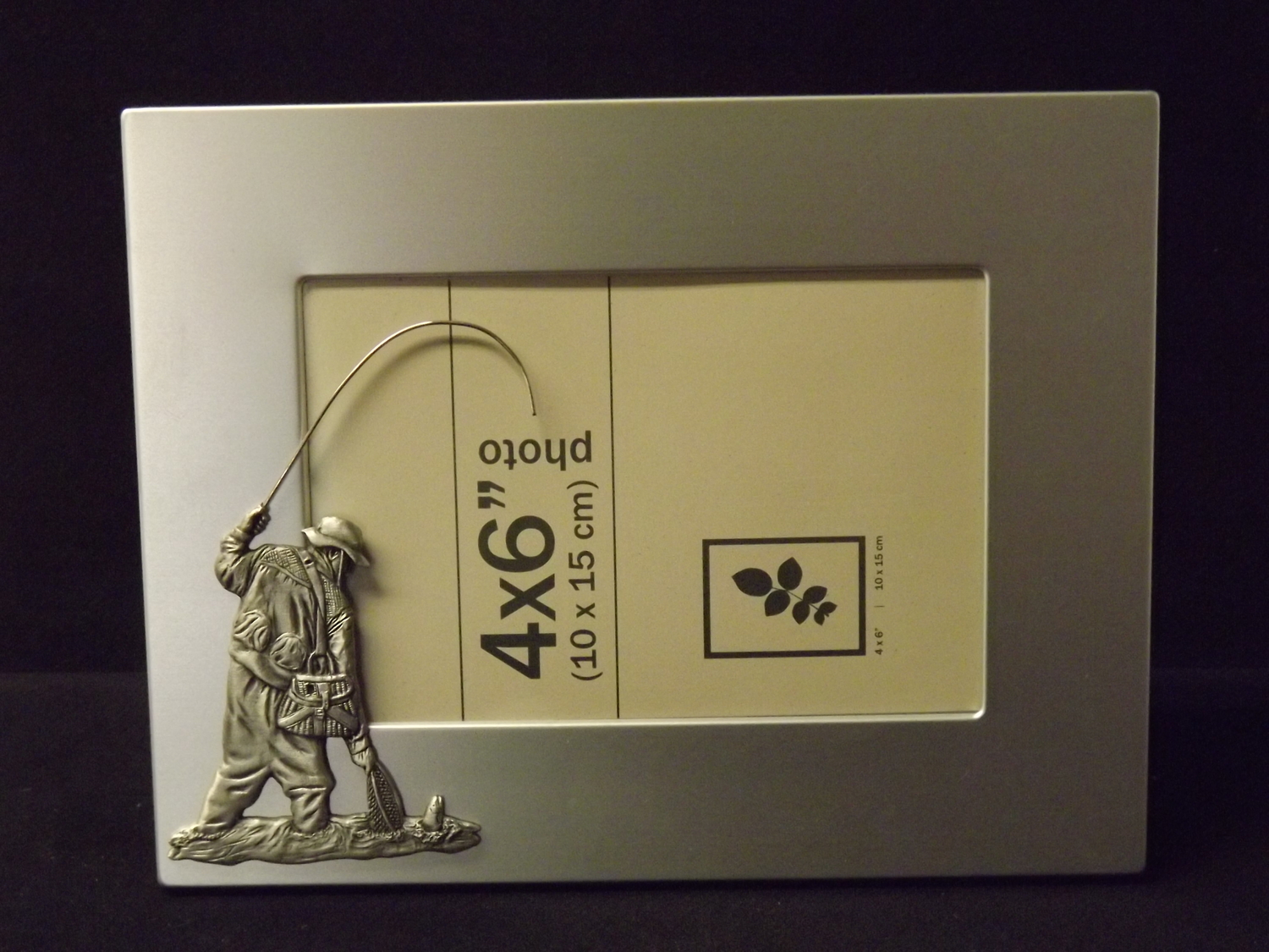 Medium brushed upright aluminium picture frame with a pewter fishing embellishment.
