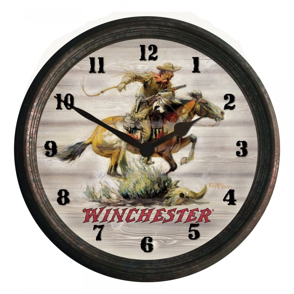 15 diameter glass covered clock with tin outer frame features a great rusted / weathered looking finish. With famous pieces of art from the Winchester Collection, they are a perfect addition to any outdoor enthusiast's decor. Uses 1 AA battery (not included). Window box packaging. Winchester is a registered trademark of Olin Corp and is used with permission.