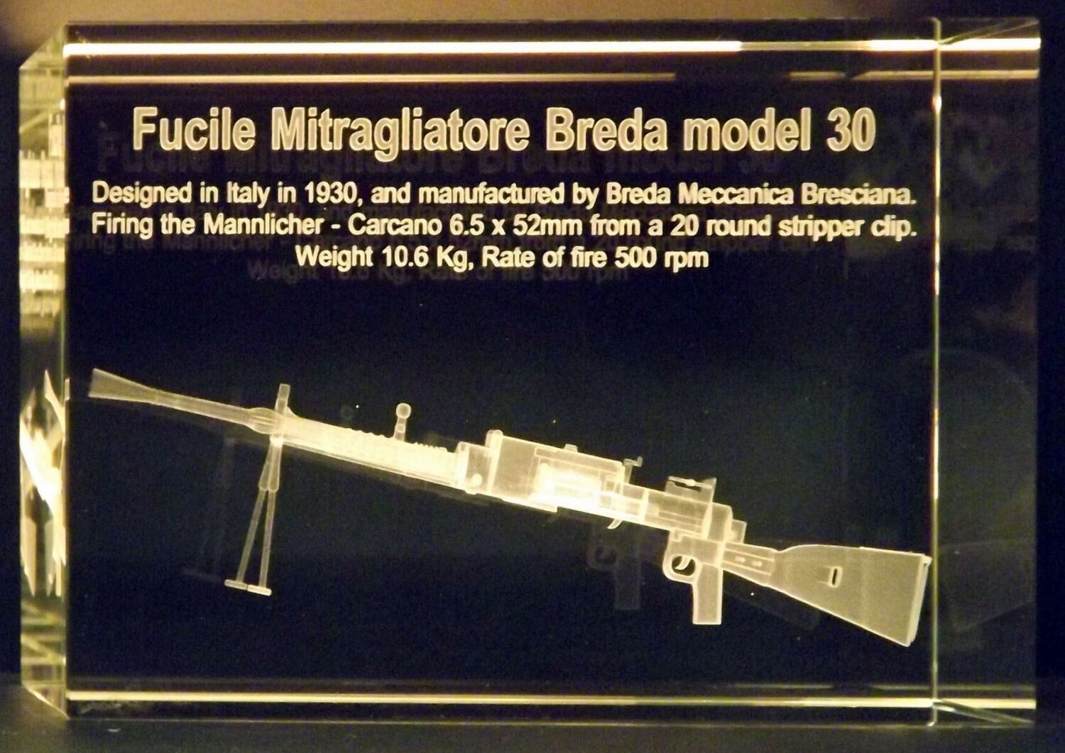 Beautiful K9 Crystal block, containing a 3D image of the Breda Modello 30 Light Machine Gun mounted on its bipod.