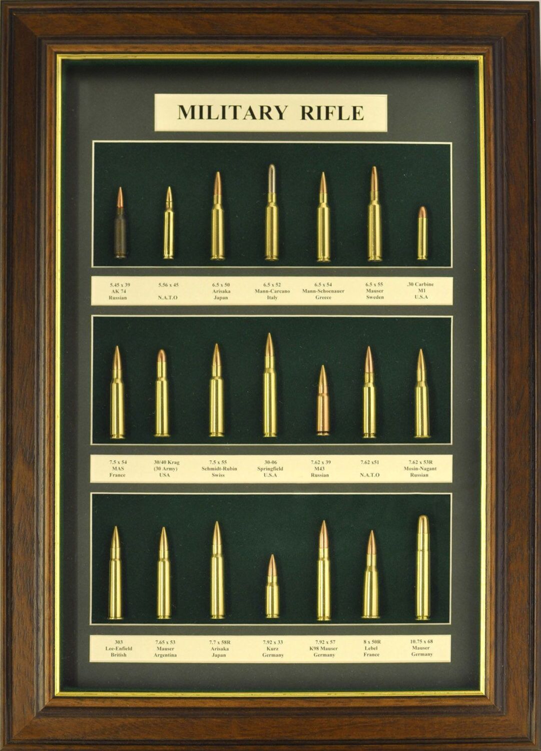 containing rounds used by the military around the world inc. 7.62 x 39 (AK47), 6.5 x 54 Mannlicher Schoenauer, 7.5 x 54 MAS, 303, 30-06, 7.5 x 55 Schmibt- Rubin, 7.9 x 57 Mauser & 6.5 Mannlicher Carcano. Housed in a 50mm antique frame, with bottle green mount and cream information blocks on green baize. Size :- 505 x 340mm (glass size)