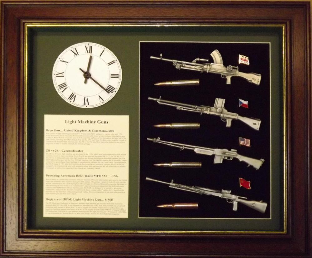 Wall Displays containing 4 miniature replicas of world war twolight machine guns, with round and information window. This series also cotains a quartz clock.