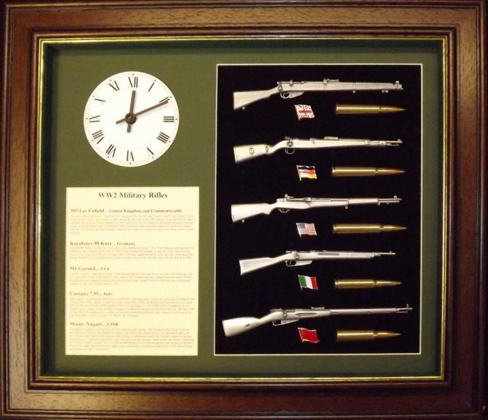 Wall Displays containing 5 miniature replicas of world war two rifles, with round and information window. This series also cotains a quartz clock.
