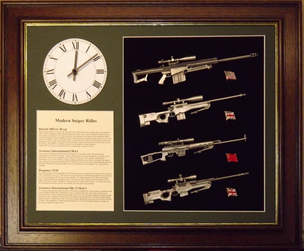 Wall Displays containing 4 miniature replicas of modern sniper rifles and information window. This series also contains a quartz clock.