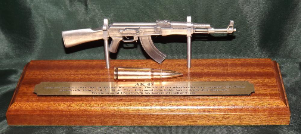 Designed between 1944-1947 by Mikhail Kalashnikov. The AK-47 is a selective-fire, gas-operated 7.62×39mm assault rifle. Using a 10, 20, 30, 40, 75 or 100 round detachable box or drum style magazine. Weight around 10.5 lbs/4.78 kg. Length 34 inches/ 87cm.