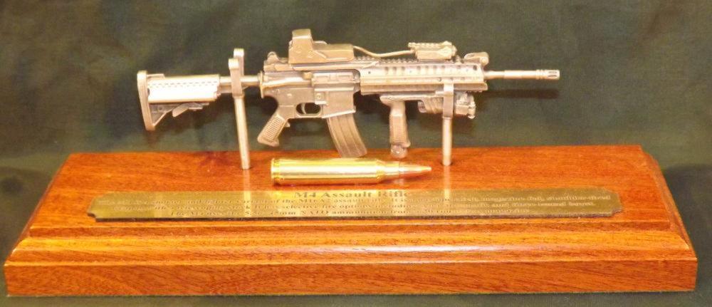 The M4 is a shorter and lighter variant of the M16A2 assault rifle. It is a gas-operated, magazine-fed, shoulder-fired weapon with a telescoping stock It has selective fire options including semi-automatic and three-round burst. The M4 uses the 5.56×45mm NATO ammunition from a 30 round box magazine .