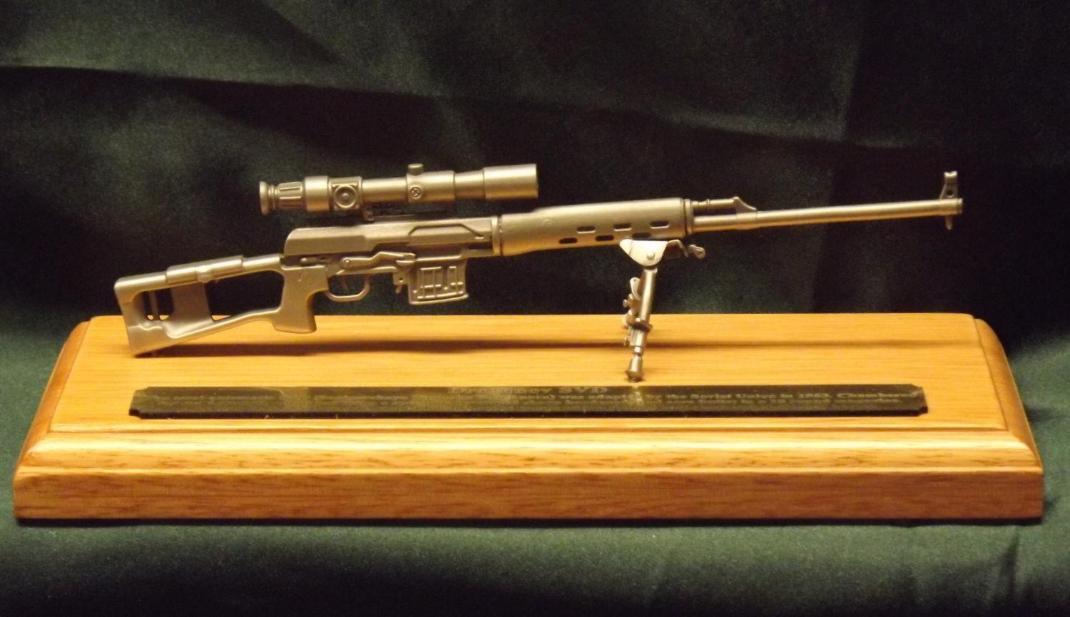 The semi-automatic SVD (Snaiperskaya Vintovka Dragunova) was adopted by the Soviet Union in 1963. Chambered for the 7.62x54R round but using a specially developed sharp hardened steel core bullet in a 10 round magazine. A version of the SVD was developed for airbourne troops with a folding butt stock and shortened barrel.