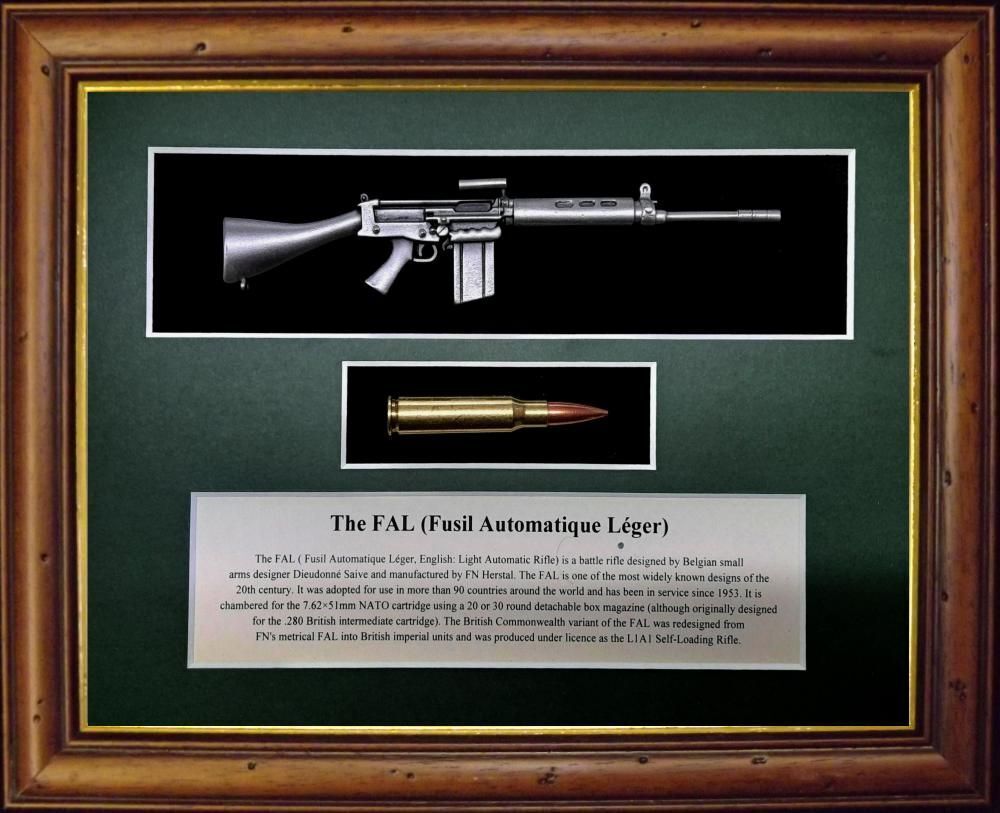 Antiqued English Pewter 1/6 mounted replica of the FN FAL rifle along with a round (deactivated) and a short information panel.