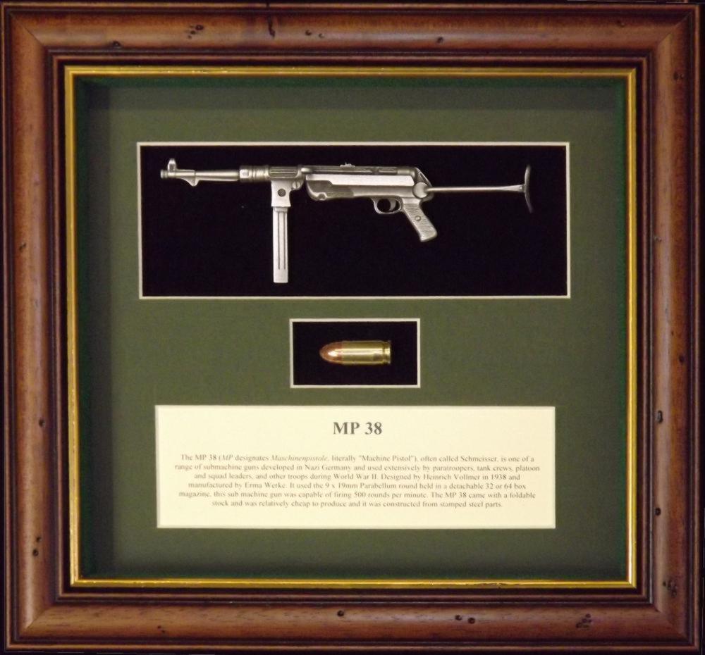 Antiqued English Pewter 1/6 mounted replica of the MP38 machine pistol and 9mm round (deactivated) with a short information panel.
