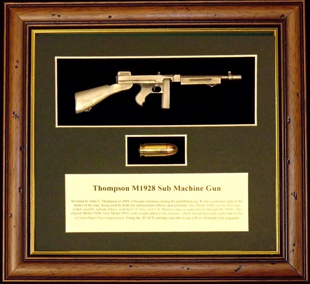 Invented by John T. Thompson in 1919, it became infamous during the prohibition era. It was a common sight in the media of the time, being used by both law enforcement officers and criminals. The Model 1928 was the first type widely used by military forces, with the U.S. Navy and U.S. Marine Corps as major buyers through the 1930s. The original Model 1928s were Model 1921s with weight added to the actuator, which slowed down the cyclic rate of fire, a United States Navy requirement.Firing the .45 ACP cartridge and able to use a 20 or 30-round stick magazine