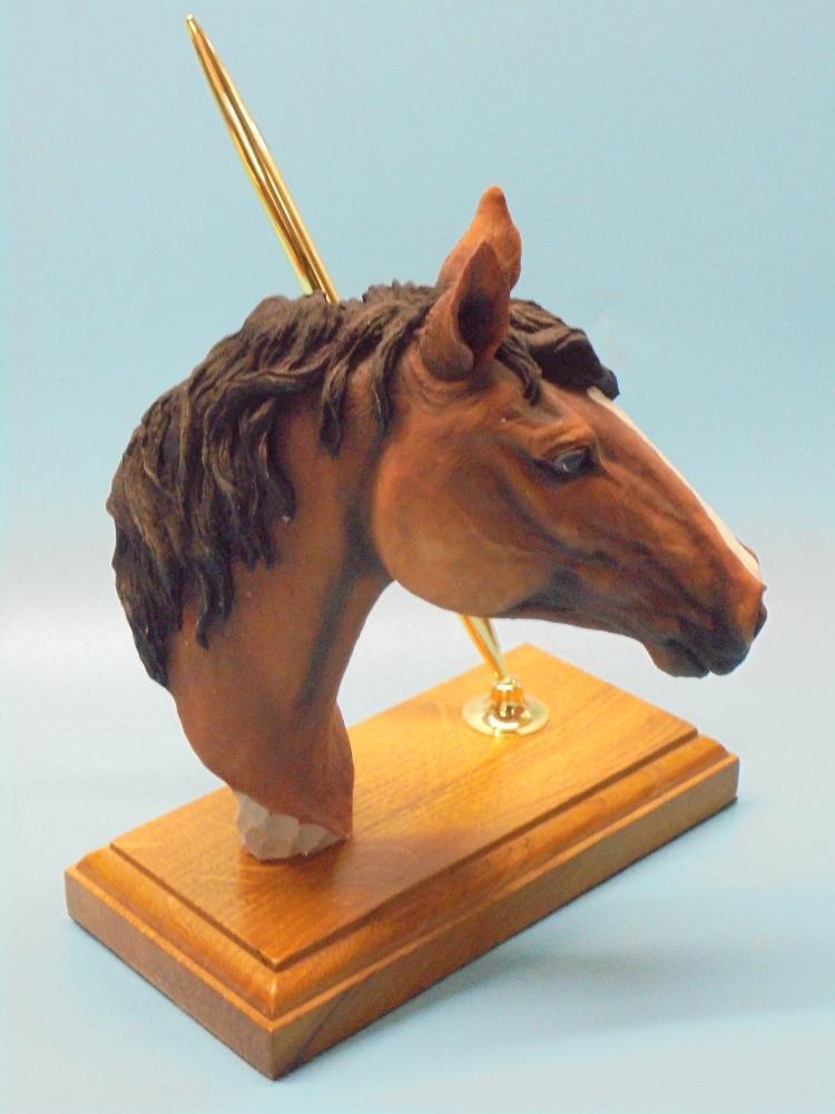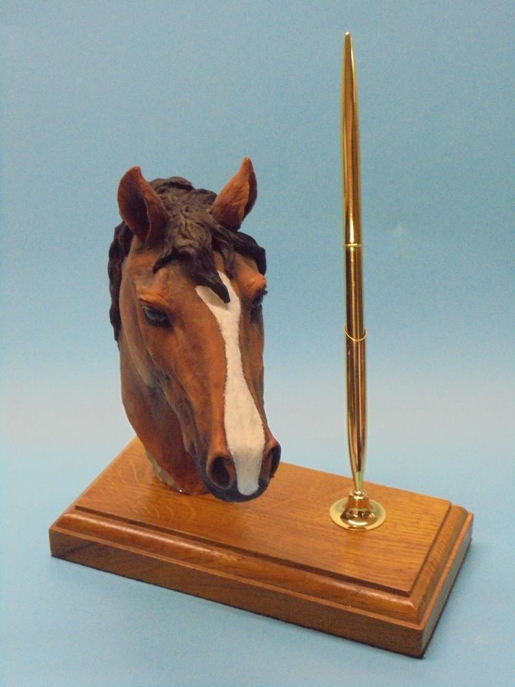 Hand paintedChestnut Horse head on a light oak wooden plinth along with a gold coloured pen and trumpet (pen holder) set