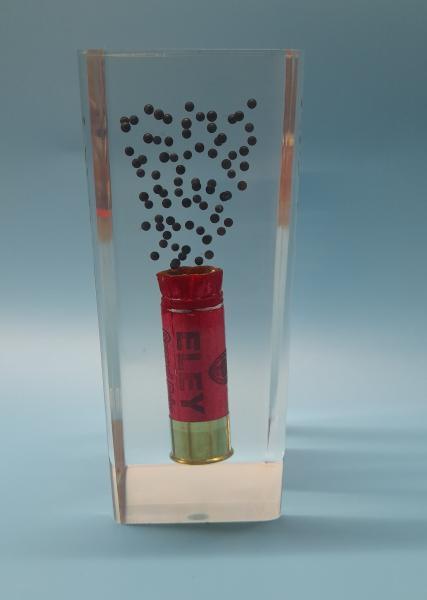 Acrylic display containing a Genune Eley paper case "Grand Prix" 12 gauge cartridge and number 6 shot.