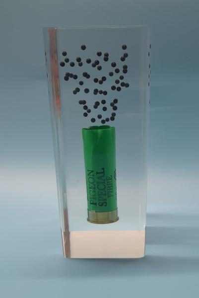 Acrylic display containing a Pigeon Special 12 gauge cartridge and number 6 shot.