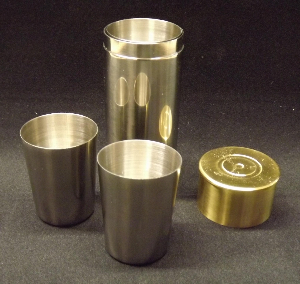 Stainless steel and brass cartridge shaped cup holder along with 8 x 45ml numbered cups for peg finders.