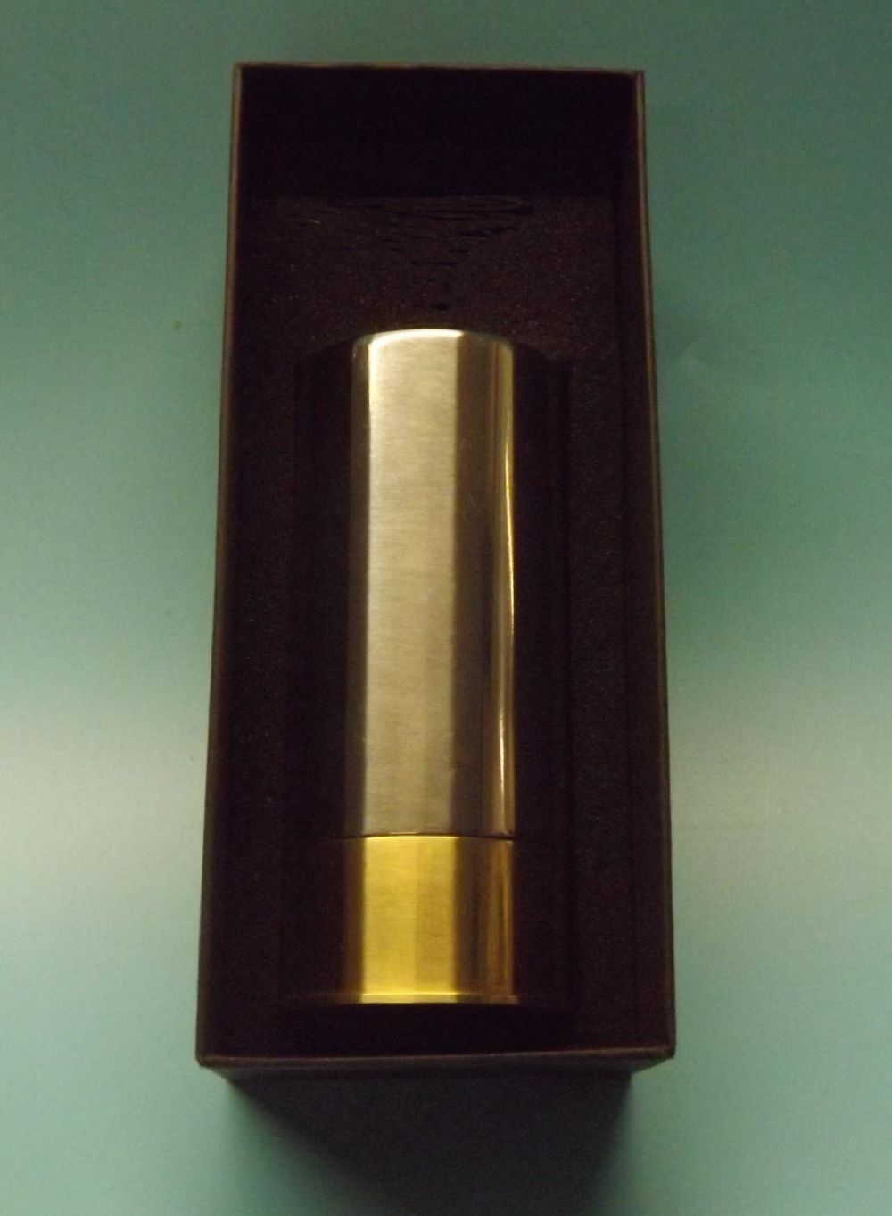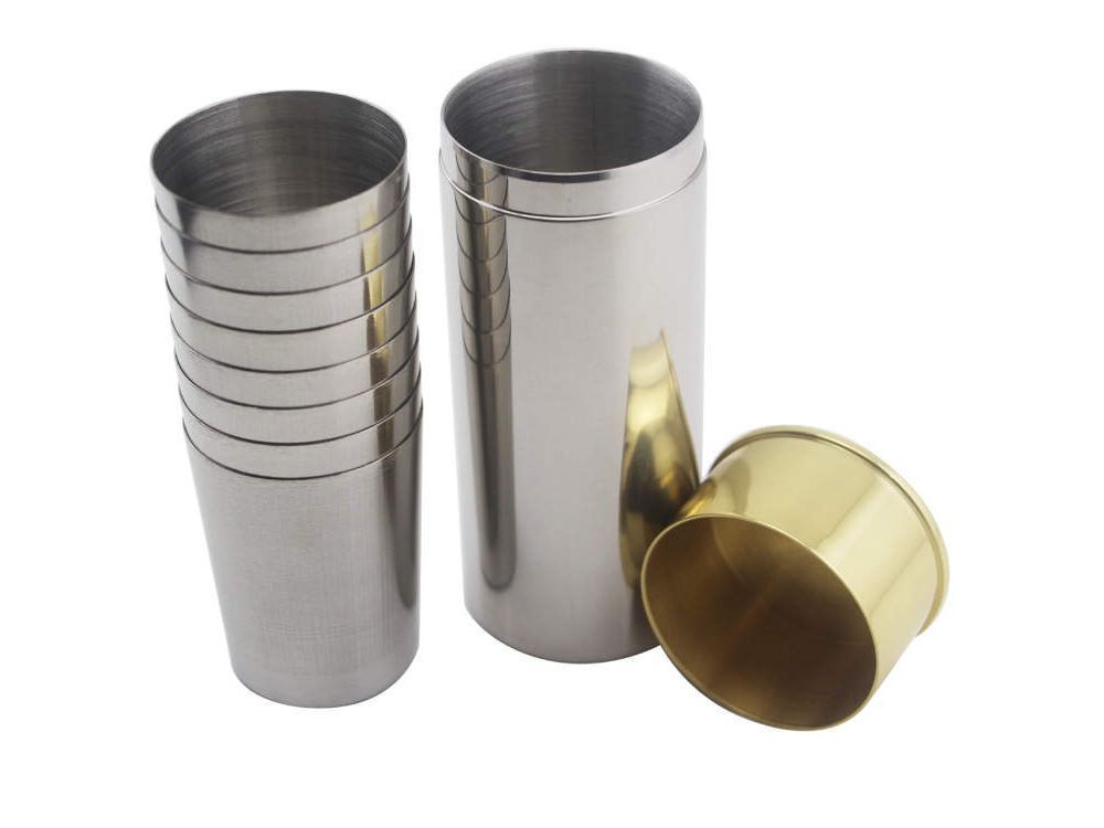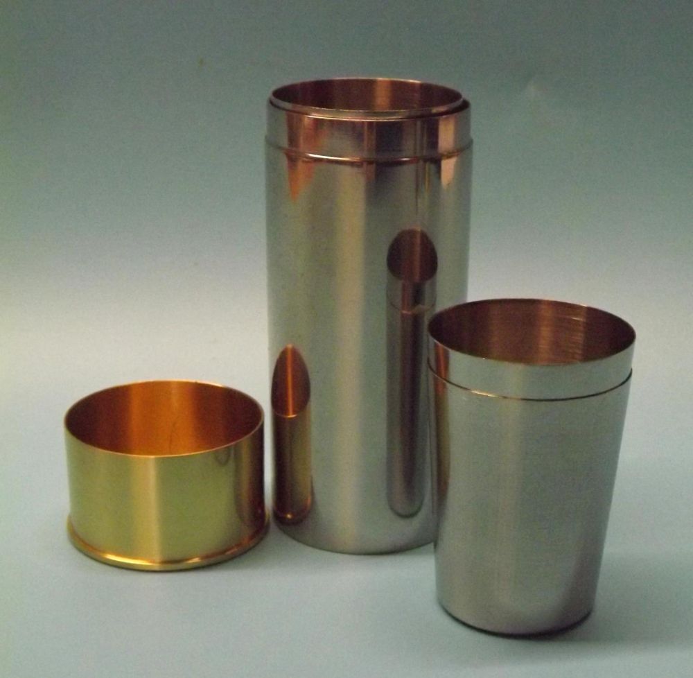 Stainless steel and brass cartridge shaped cup holder along with 9 x 30ml cups for peg finders.