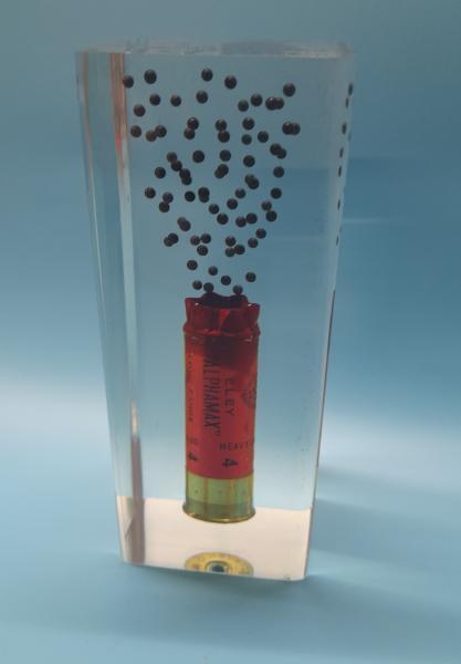 Acrylic display containing a Genune Eley paper case "Alphamax" 12 gauge cartridge and number 6 shot.