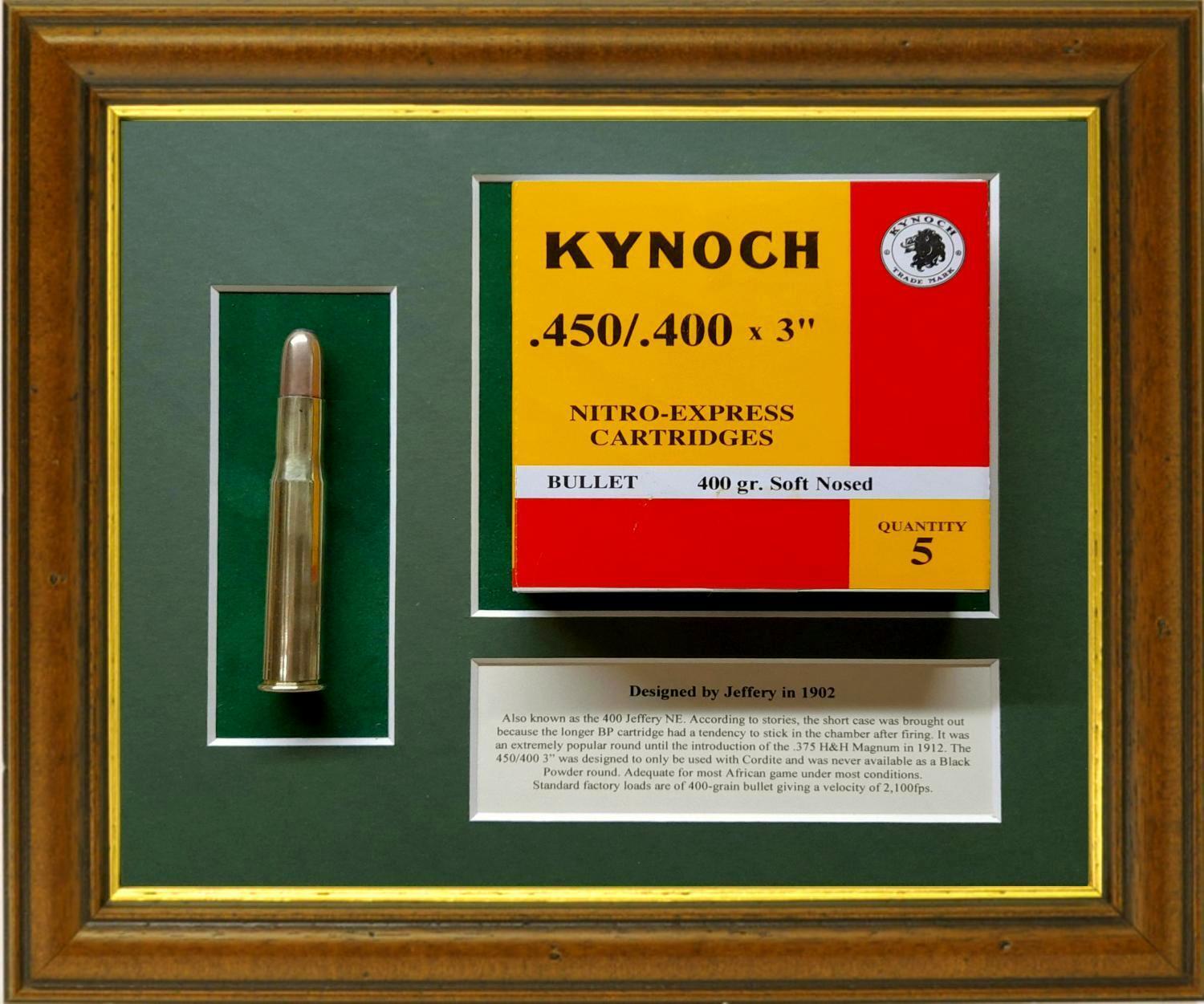 Small Displays containing an original Kynoch cartridge box, a round of that calibre and a history