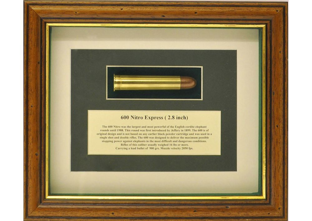 600 Nitro Express case and head with a short history of the round, housed in an antique frame with bottle green mount and green baize background.