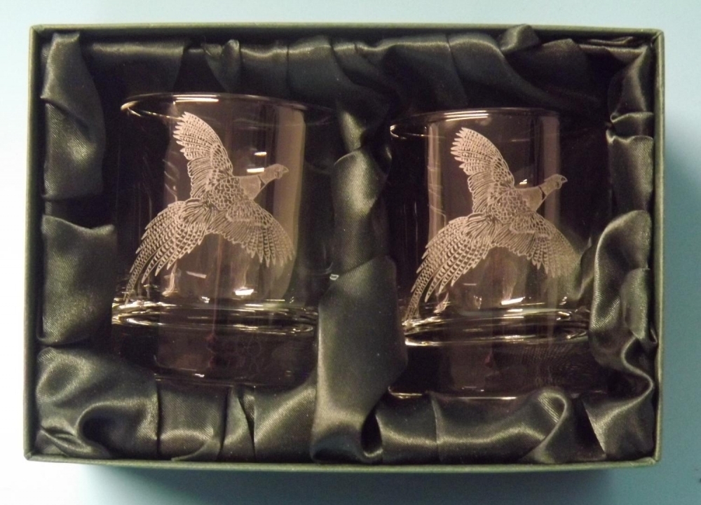 2 Engraved 20cl Whisky Glasses with Flying Pheasant Image