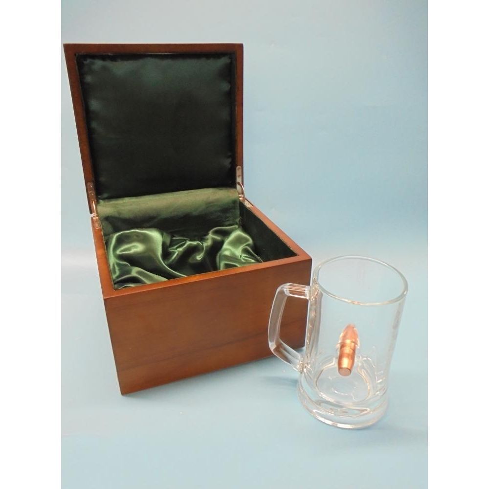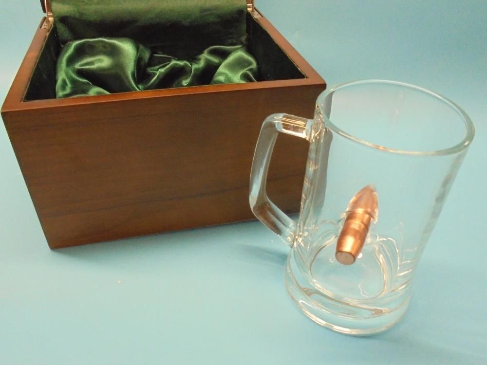50 calibre bullet in 0.5 pint/ 385ml tankard in a wooden satin lined gift box