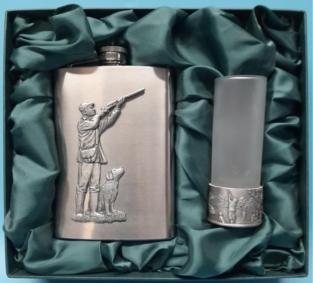 8oz mat hip flask with a pewter 2D embellishment of a pheasant shooter along with either a pheasant shooting embossed based frosted shot glass or Grouse shooting embossed based frosted glass