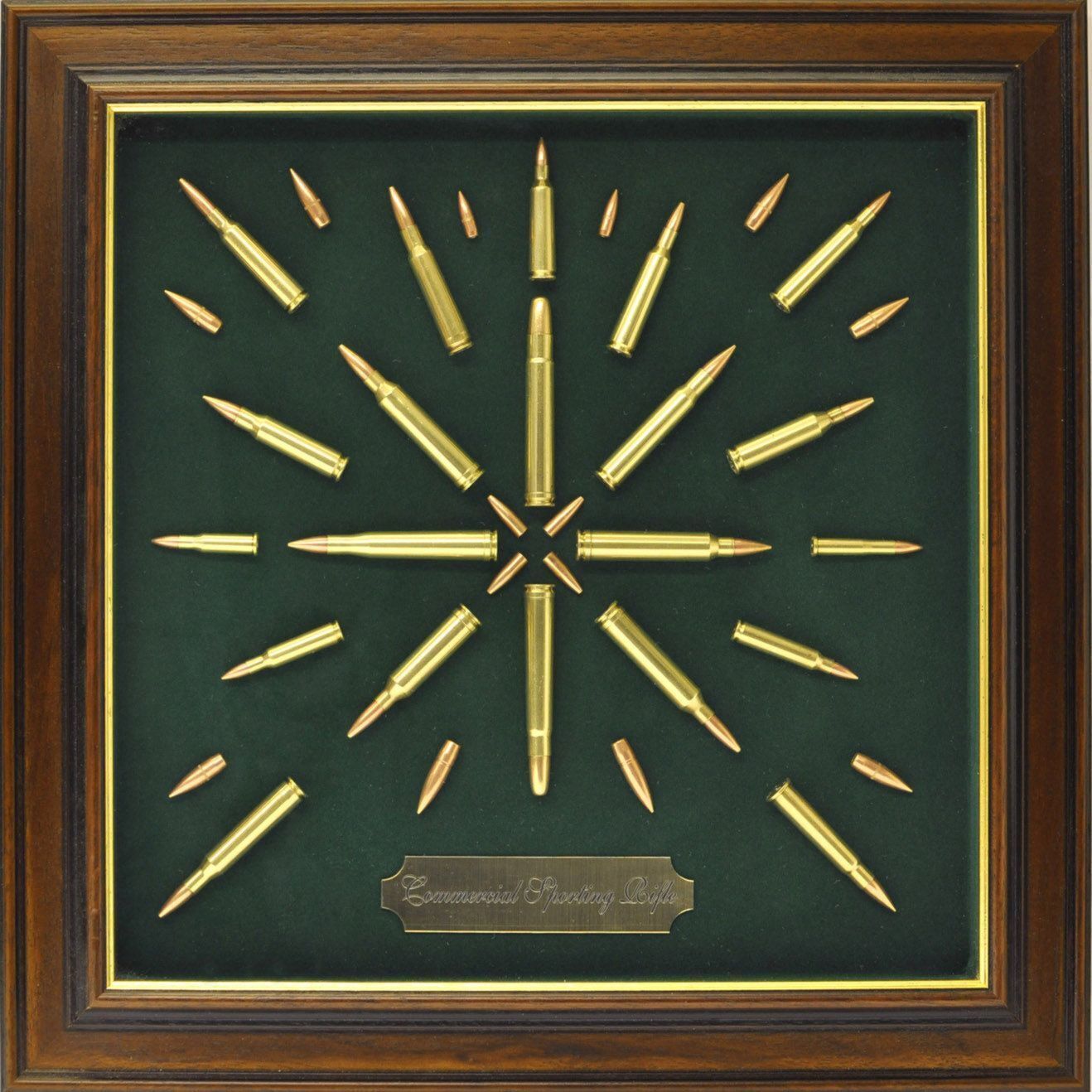 Housed on a 50mm antique style frame with bottle green mount and green baize background, with information on each round. Inc. 416 Remington, 375 Holland & Holland, 300 Winchester Magnum and 300 Holland & Holland