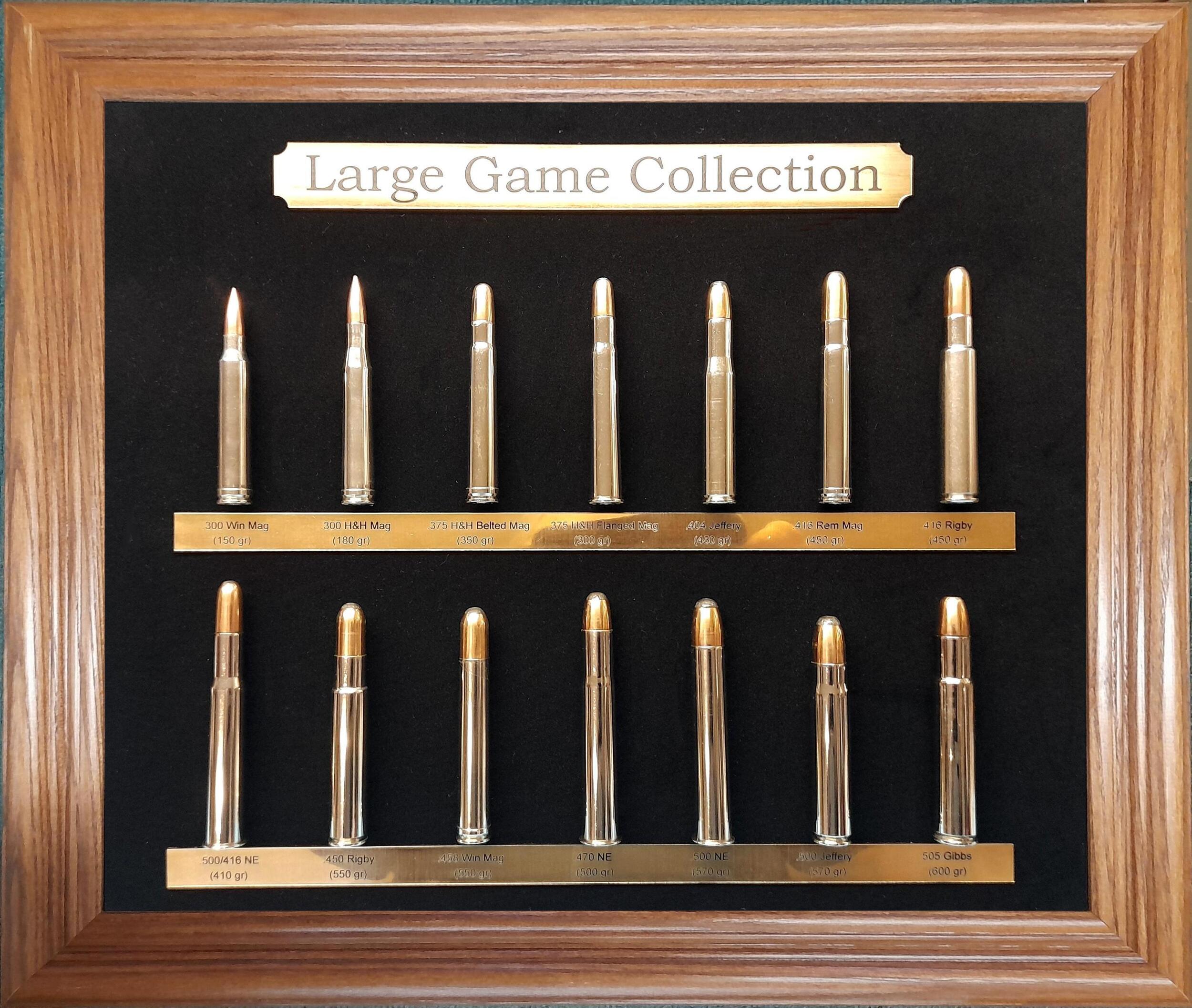 containing deactivated chromed calibres from .300 Win Mag to 505 Gibbs along with the bullet weight/ grains