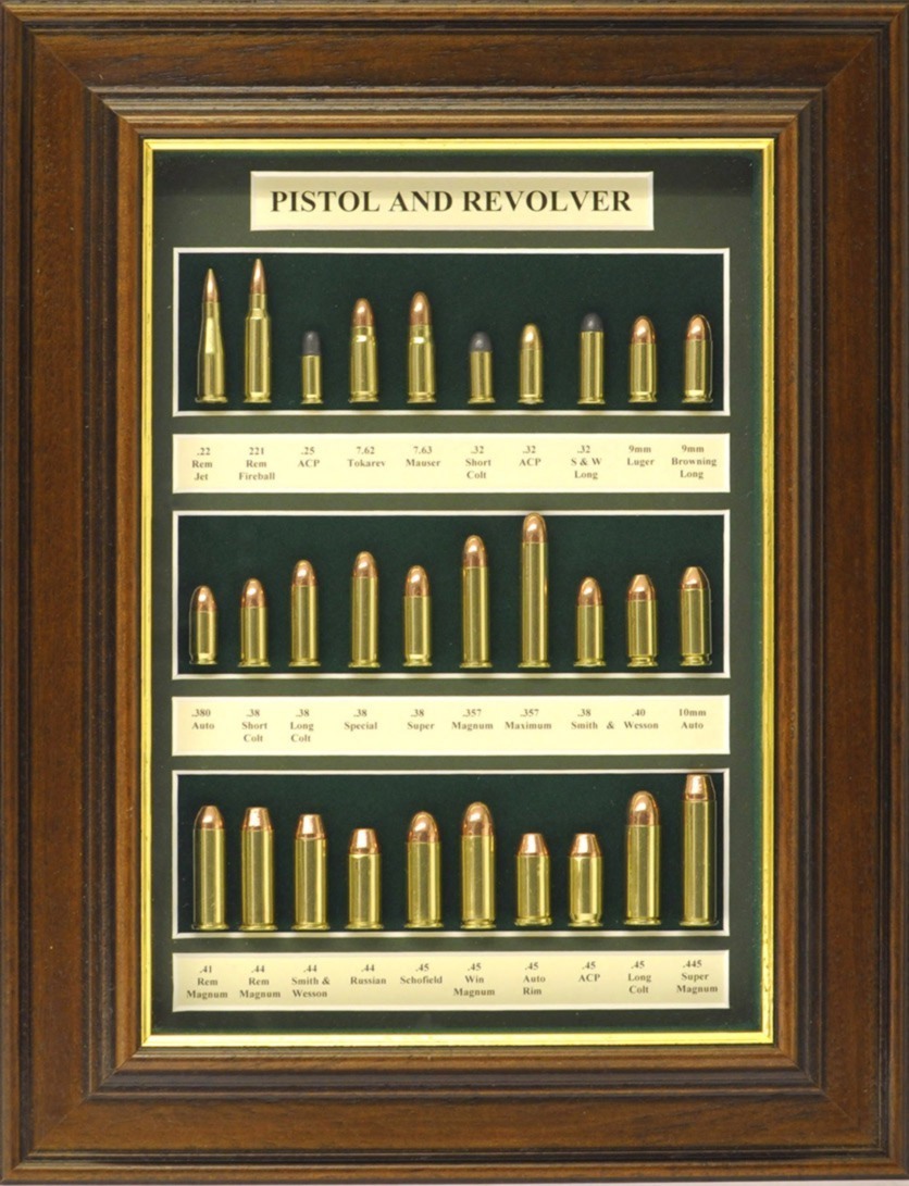 Calibres from .25 up to .45 magnum. Housed in a 50mm antique style frame with bottle greem mount and green baize background. Size :- 300 x 210mm (glass size)