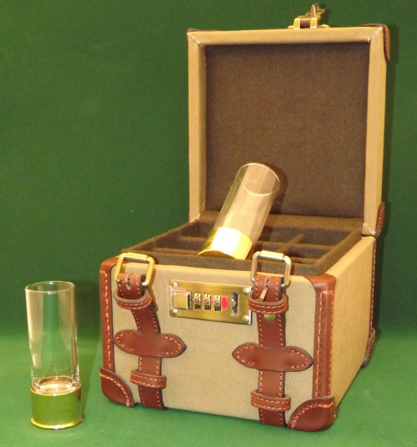 These are the new top of the range shot/ position finder shot glass and carrying case in a sage green canvas with brown leather trim. These carrying cases are hand made by a well know gun case maker in the style of a high end gun case and have 9 glasses with a 24k gold plated base. Each glass is numbered inside on the base for use as a peg/ position finder from TMB Designs