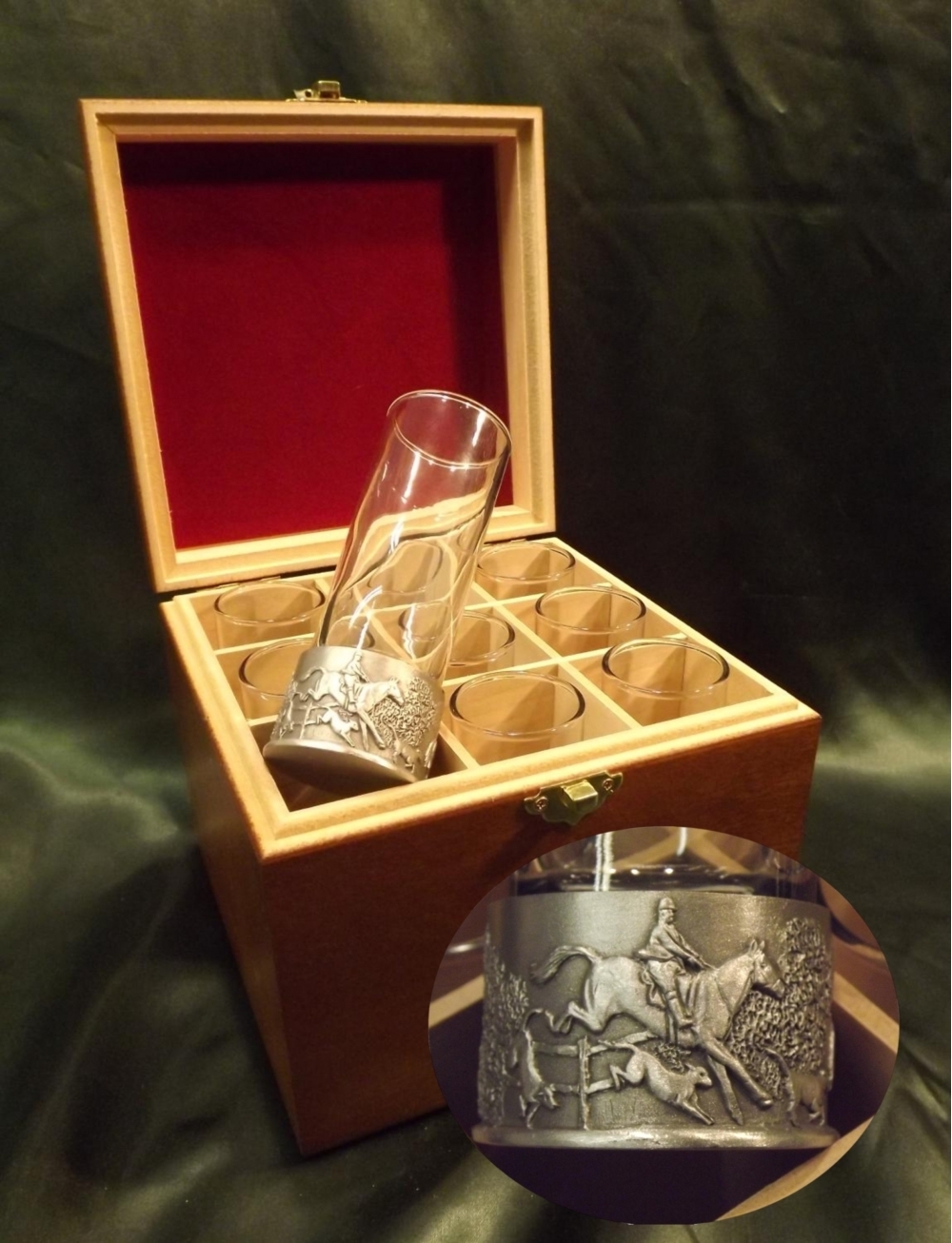 These glasses are the top of the range produced by TMB Designs. Currently in this series they have 6 different hunting scenes, which were hand carved onto the master to make these current designs. Very elegant and very different from our stand range of shot glasses. Each carry a 6cl glass and all types of glasses are available in a set of 9 in a walnut coloured box.