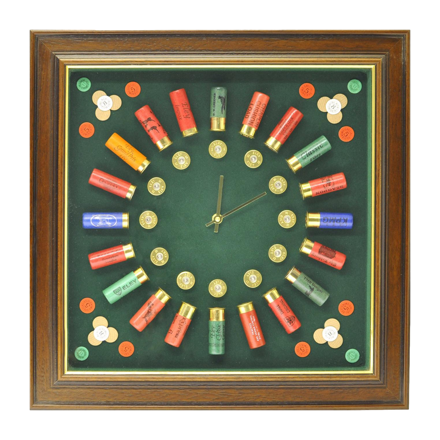 Paper Cases Clock containing 12g deactivated cartridges, housed in an attractive 50mm antique frame on green baize background and containing over shot cards. Size - 380 x 380mm (glass size)