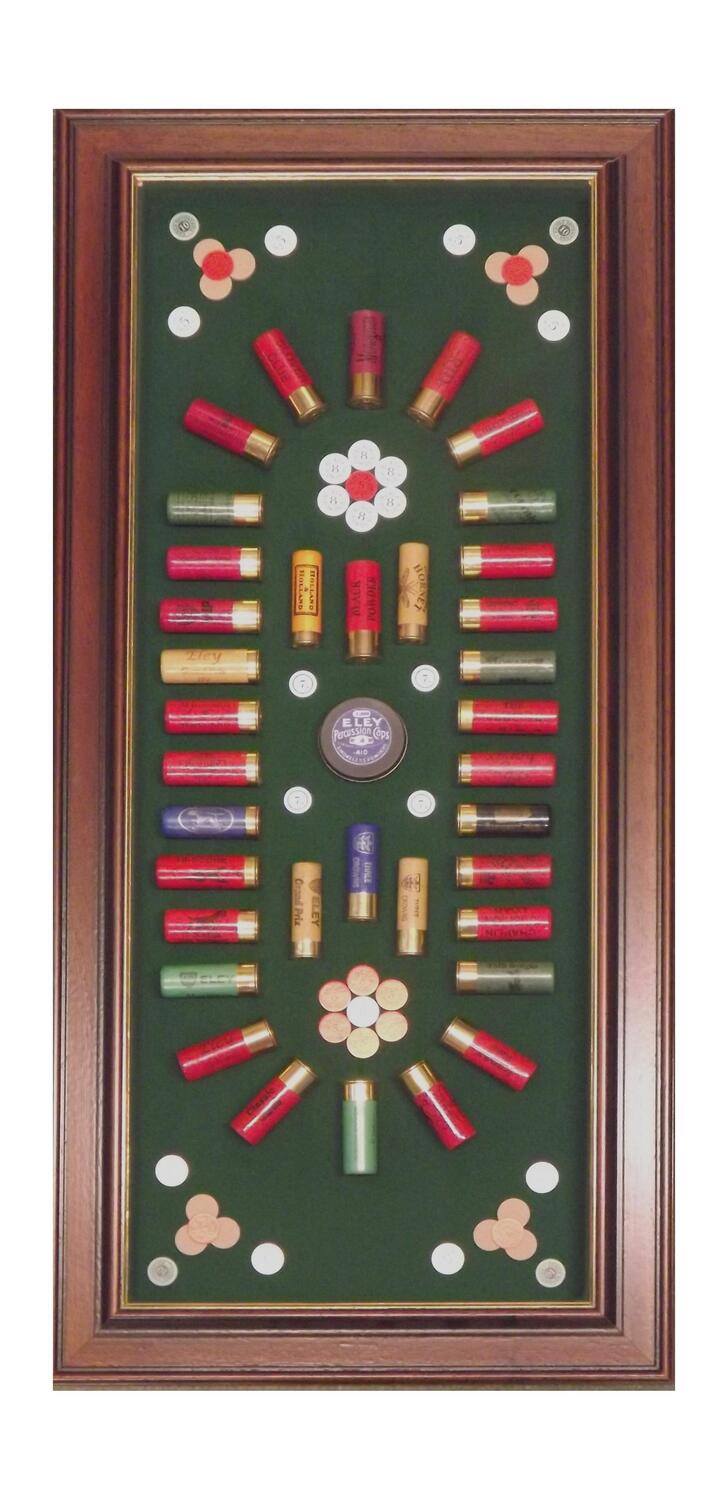 Paper Cases Display containing 12g, 16g and 20g deactivated cartridges, attractively housed in a 50mm antique frame with green baize background, over shot cards and primer tin and label. Size :- 660 x 280mm (glass size approximately)