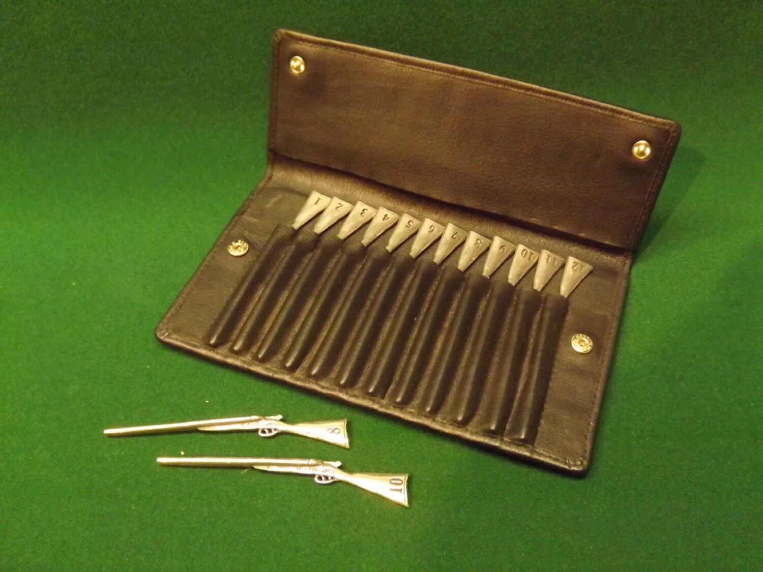 Miniature Pewter shotgun SBS Peg finders, Numbered 1-12 in a real leather wallet