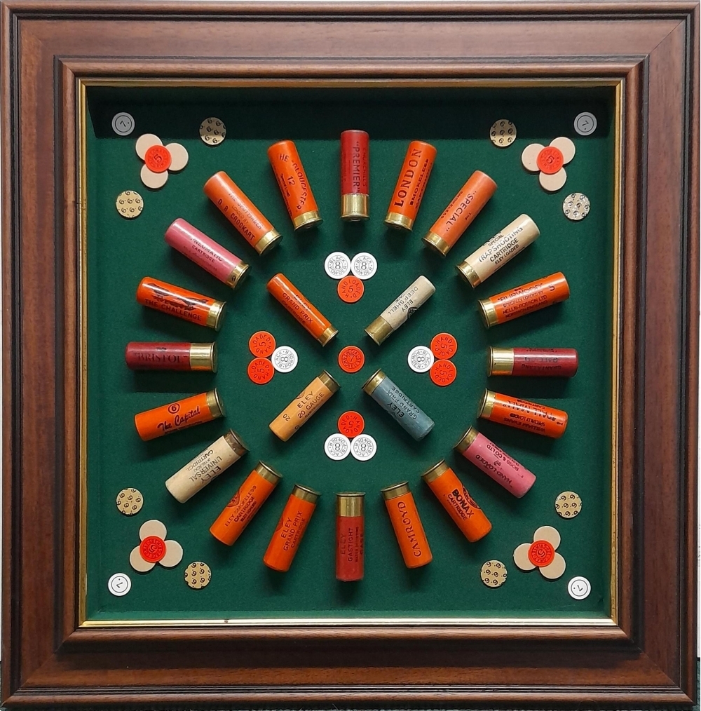 Housed in an attractive 64mm antique frame on green baize background and containing over shot cards.